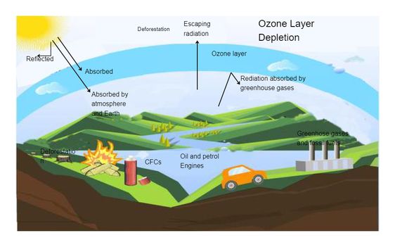 • ओजोन परत का क्षय (Ozone Layer Depletion) – हानिकारक गैसों के कारण ओजोन परत में छेद जिससे पराबैंगनी (UV) किरणें सीधे पृथ्वी तक पहुँचती ।